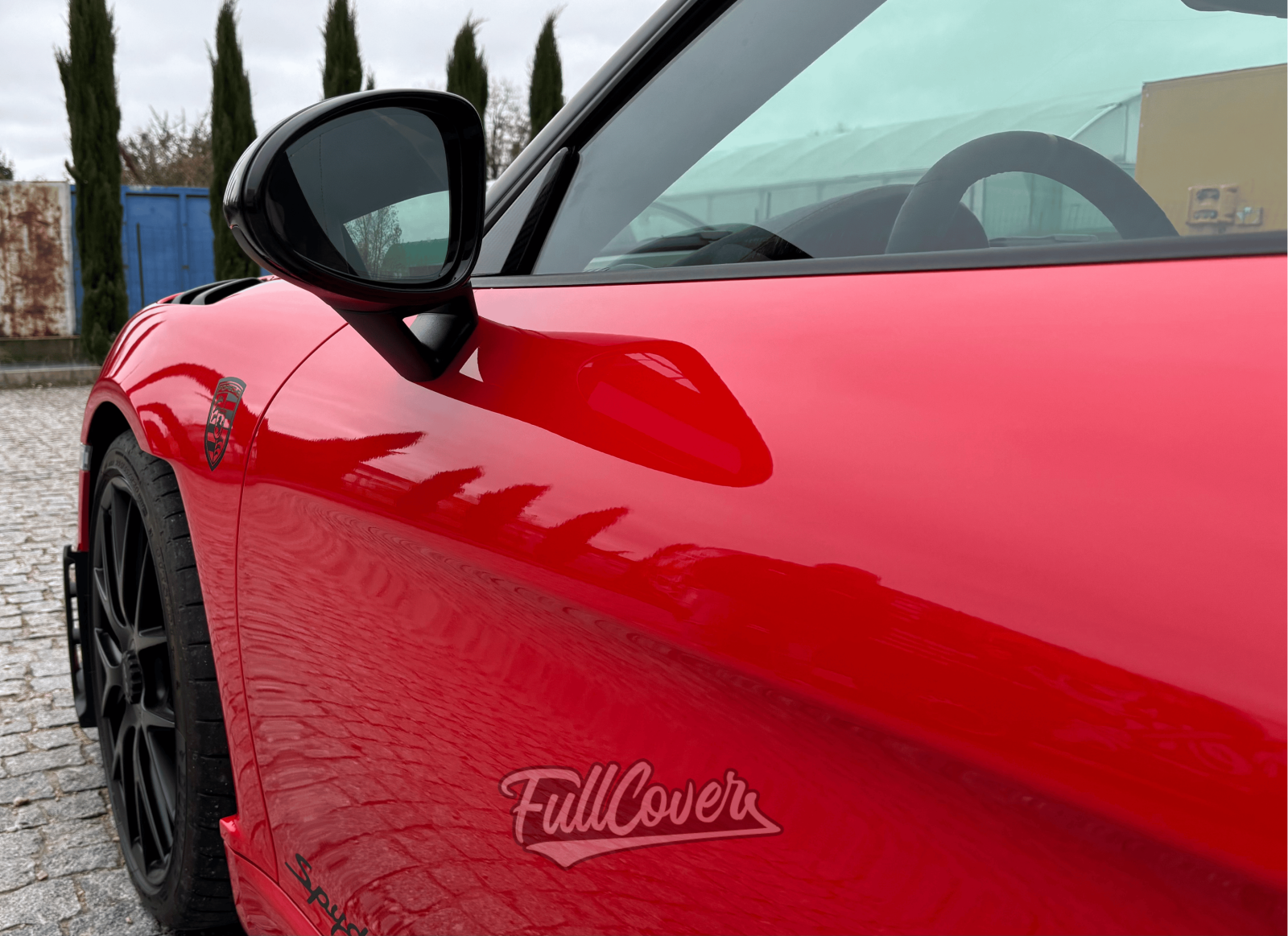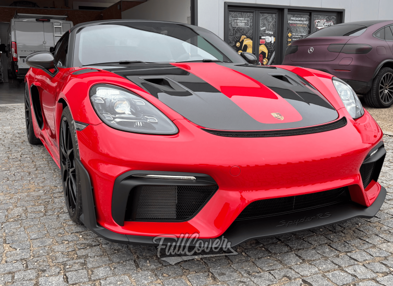 Cette Porsche 718 Spyder RS rouge a bénéficié d’une pose de film de protection carrosserie PPF intégrale dans notre atelier FullCover près d’Orléans, une prestation haut de gamme parfaitement adaptée à ce modèle d’exception orienté performance pure. Véritable concentré de sportivité, le Spyder RS se distingue par ses lignes radicales, ses surfaces complexes et sa teinte rouge éclatante, particulièrement sensible aux agressions extérieures lors d’une utilisation dynamique.